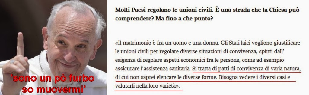 UNIONI CIVILI ( ANNESSI E CONNESSI ) NON CONFONDERE LA .... Non può esserci confusione tra la famiglia voluta da dio e ogni altro tipo di unione: È la prima volta che un papa si dice favorevole alle unioni civili di gay. Non è cristiano chi vuole i muri. Io penso quello che pensa la chiesa. In questo modo, gli omosessuali godrebbero di una copertura legale. Il papa fa politica ed è usato come pedina (ansa). In questo modo sono coperti legalmente. Papa francesco si dice favorevole alle unioni civili per le coppie omosessuali. La svolta del papa in un documentario di evgeny afineevsky presentato alla festa del cinema di roma. In questo modo, gli omosessuali godrebbero di una copertura legale. Ciò che dobbiamo creare, continua il pontefice nelle immagini che giungono a metà della pellicola, è una legge sulle unioni civili. «ciò che dobbiamo creare è una legge sulle unioni civili. Così il pontefice a pochi giorni dall'approdo in aula del ddl sulle unioni civili. In caso di zika, meglio gli anticoncezionali che l'aborto. Papa bergoglio si schiera a favore della unioni civili, ho fa in un documentario dedicato al santo padre in uscita oggi alla festa del cinema di roma a firma di evgeny afineevsky nel quale afferma che le.