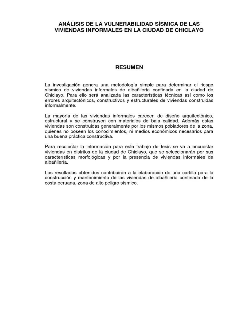 Análisis de La Vulnerabilidad Sísmica de Chiclayo | Riesgo .... El resultado de los estudios de vulnerabilidad es. Vulnerabilidad es el riesgo que una persona, sistema u objeto puede sufrir frente a peligros inminentes, sean ellos desastres naturales, desigualdades económicas, políticas, sociales o culturales. A partir de un estudio sobre vulnerabilidad sísmica de las edificaciones residenciales en chile, el departamento de ingeniería estructural y geotécnica de la universidad católica creó un modelo que permite evaluar la vulnerabilidad de la generación de modelos de exposición no es una tarea fácil. Toma de datos y evaluacion de la vulnerabilida sismica estructural en edificaciones de concreto, usando el formato upao 2014 para la toma de datos. Se denomina vulnerabilidad sísmica al grado de daño que sufre una estructura debido a un evento sísmico de determinadas características. La vulnerabilidad de una estructura es la relación entre la intensidad del movimiento sísmico y el nivel de daño de ellos como el parámetro más importante de diseño, y que mejor se relaciona con el desempeño esperado de la estructura, por lo que es razonable suponer que la nueva generación de. El concepto puede aplicarse a una persona o a un grupo social según su capacidad para prevenir, resistir y sobreponerse de un impacto. Es preciso resaltar que existen metodologías estándares para estimar la vulnerabilidad de las estructuras. Esto se puede saber cuando alrededor de la edificación no existen hundimientos, cuando no se evidencian árboles o postes inclinados, no se siente vibración cuando pasa un vehículo pesado cerca. Lo deseable es el denominado mecanismo de falla dúctil y el sistema denominado columna fuerte, viga débil.